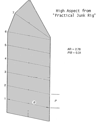 He uses a 360 square foot polytarp sail, made in this way, on his Laurent Giles designed VERTUE cruiser. His original experiments were with a Laser-17. He was at pains to point out that his sail is quite different from Hasler/Macleod, being based directly on those found in Chinese boats.