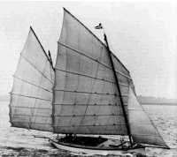 Sail on Bob's canoe yawl. The boom is swung toward the camera and is longer than it looks. It did work, though we had almost no wind, and not enough time to work out all the sheetlet lengths to our complete satisfaction. |