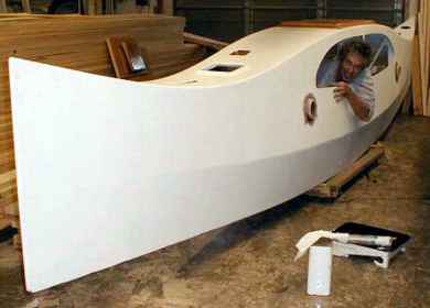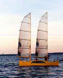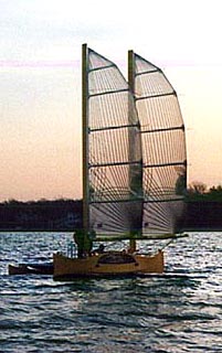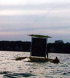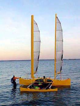 MBULI hits the water. That's me on the trampoline and Lee, captain of the chase-kayak, pulling the vessel out into deeper water. Those are rotating wingmasts. John and I got in a short sail, had a knockdown. The wingmasts held the boat on its side and we flipped the ama back down with help from the chase boats. |
