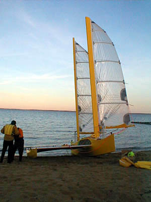 MBULI on the beach. Water temperature 38 degrees. Air? Don't ask. The main hull is a simple flat-bottom shape which two people can carry. The sails are 120 sq. ft. each. |